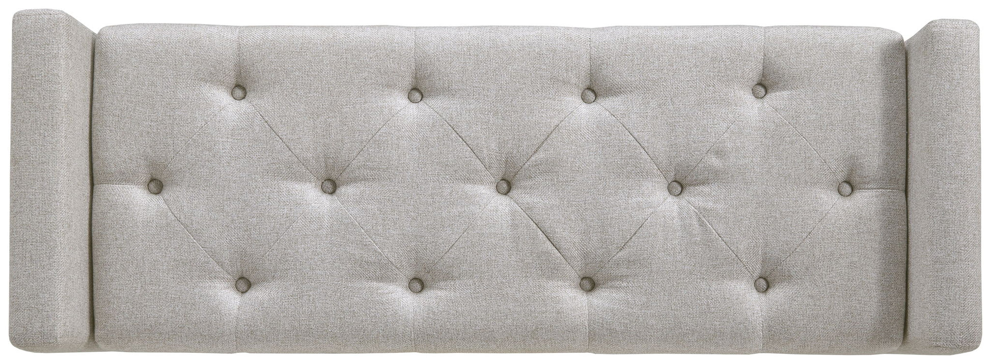 Contemporary style gets practical with this bench. The tufted beige seat cushion is hinged to allow easy access to whatever you need to hide in plain sight. Raised edges give the impression of arms, while the light brown finished wood legs help it blend with many different modern styles.