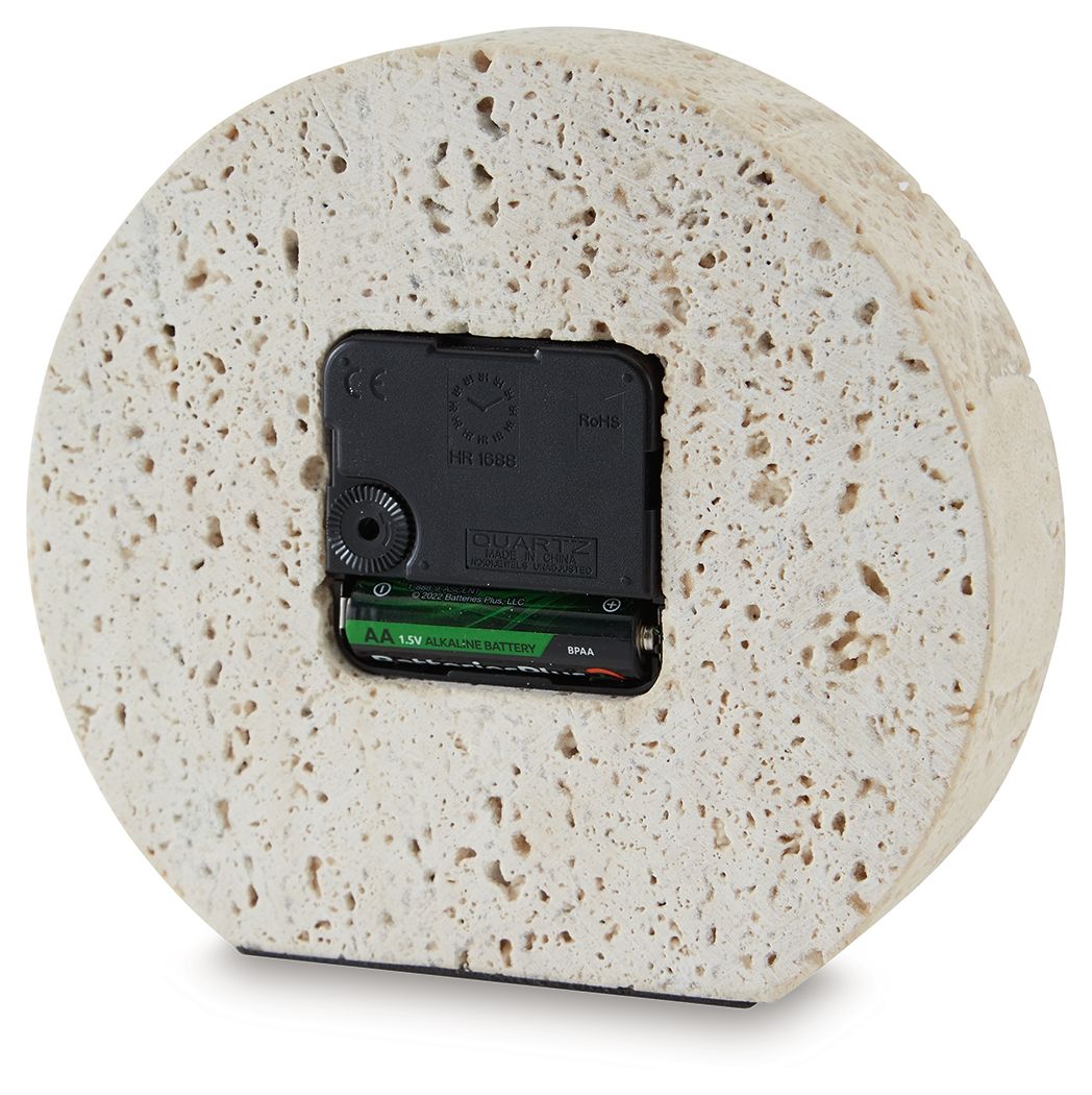 Take note of the time in contemporary style. Crafted from beige travertine, this clock is sure to lend minimalist flair to shelves and tabletops. Black accents provide a dramatic contrast to the earthy sensibility of the simple-yet-sophisticated timepiece.