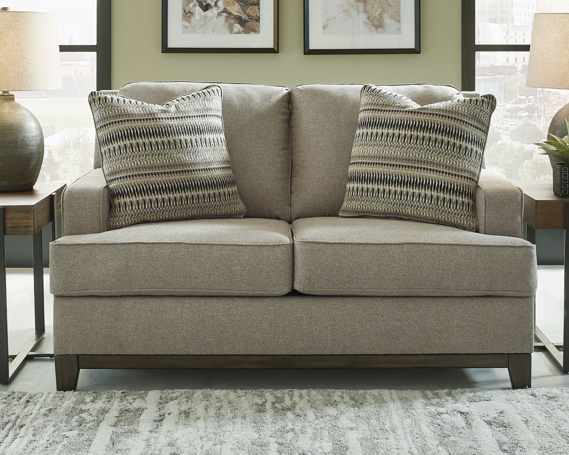 Whether your style is American classic, contemporary or an eclectic mix, this beautifully versatile loveseat is sure to look right at home. Distinctive elements include an exposed rail, designer accent pillows and decadent woven upholstery in a rich neutral shade inspired by tailored menswear.